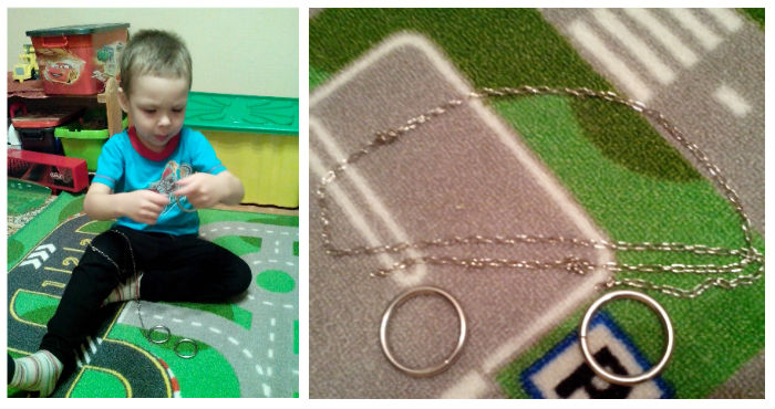 Изобилие современных интерактивных игрушек, которые можно купить в Самаре, становится настоящим злом для малыша. Звуковые и световые стимуляторы угнетают его психику, а примитивное манипулирование кнопочками лишает творческой активности и свободы действий. Для игры, которую предлагаю я, можно использовать любые кольца и цепочки, понравившиеся вам и вашему малышу. Мы взяли фурнитуру от старых сумок - настоящее мальчишеское сокровище. Для девочек, возможно, лучше подойдут изящные мамины колечки.