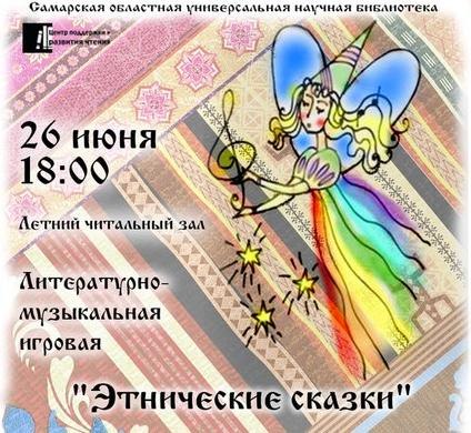 26 июня в 18.00 Cамарская областная универсальная научная библиотека приглашает вас в Летний читальный зал "Мысли" на литературно-музыкальную игровую «Этнические сказки». Калейдоскоп эпох и культур вниманию зрителя представят молодые авторы Дмитрий Ахметшин, Егор Ликсон, Елизавета Кузьмичева, Алина Алиева, музыканты Александр Пискунов, Антуан Стеньков, а также творческие коллективы Самарской области. Мероприятие Вконтакте http://vk.com/event54804440 - здесь можно посмотреть, сказки каких народов можно найти на полках, а также почитать некоторые из них.