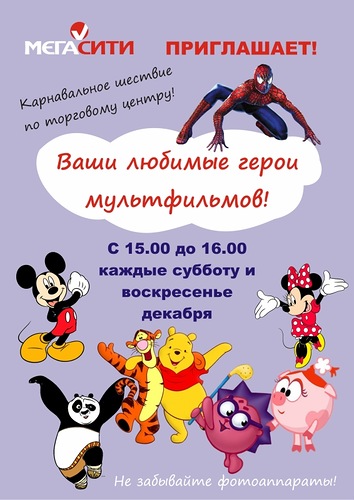 В декабре любимые герои мультфильмов оживут в МегаСити. Каждую субботу и воскресенье с 15.00 до 16.00 Винни Пух и Тигра, Нюша и Еж, Микки и Мини Маус, Человек Паук и Черепашка Ниндзя, Кунг Фу Панда и Балу пройдут по торговому центру в карнавальном шествии под живой аккомпанемент оркестра.