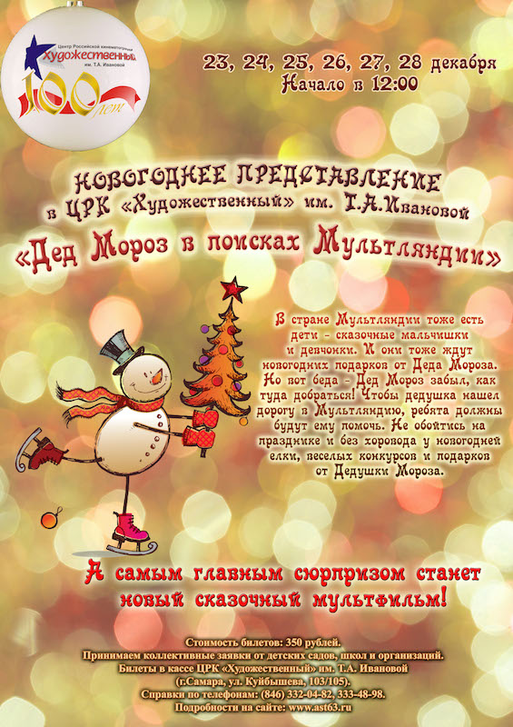 В стране Мультляндии тоже есть дети – сказочные мальчишки и девчонки. И они тоже ждут новогодних подарков от Деда мороза. Но вот беда - Дед Мороз забыл, как туда добраться! Чтобы помочь дедушке найти дорогу в Мультляндию, ребята отгадают все, даже самые сложные, загадки. Впрочем, не обойтись на празднике и без хоровода у новогодней елки, веселых конкурсов и подарков от Дедушки Мороза. А самым главным сюрпризом станет новый мультфильм, который ребята посмотрят в Большом зале кинотеатра! Стоимость билетов (с подарками): 350 рублей. Справки по тел.: 333-48-98