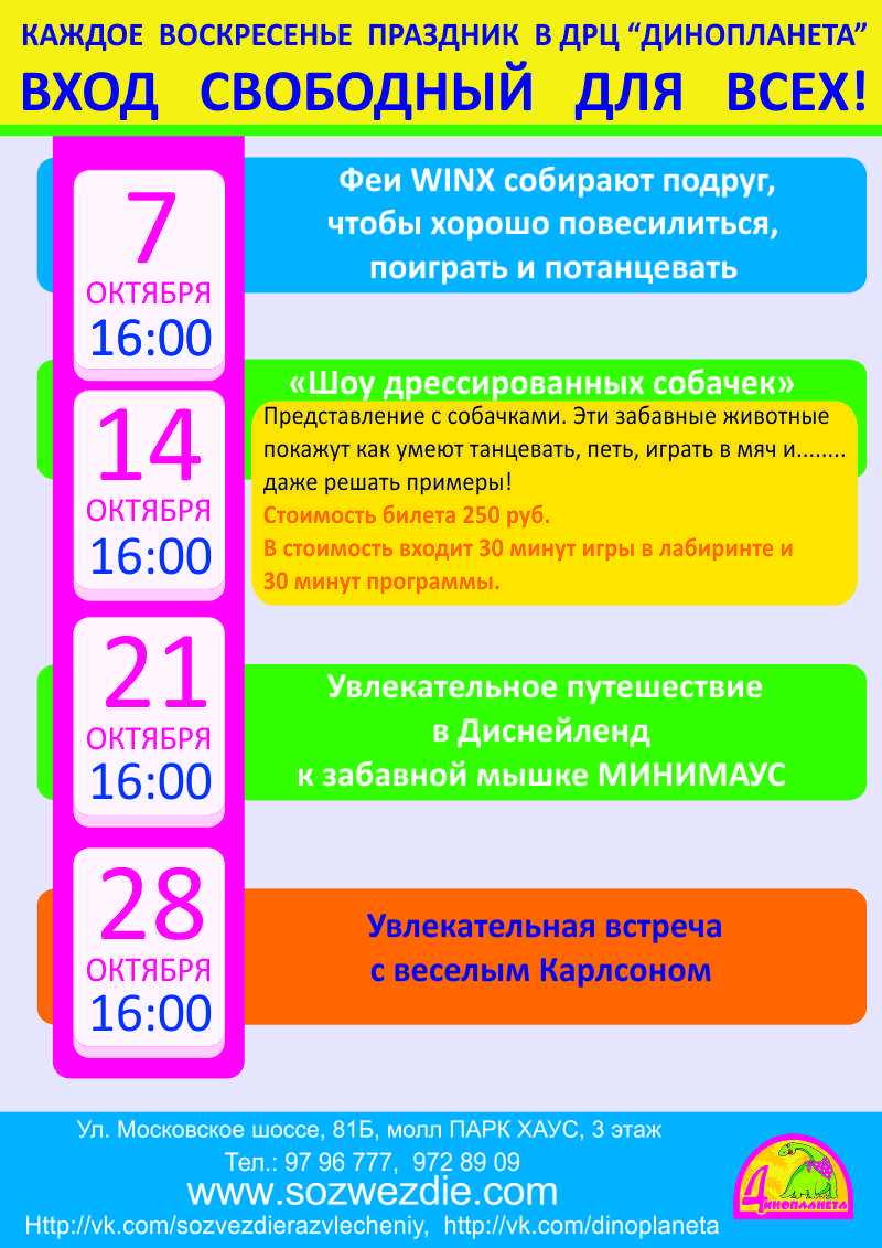 14 октября «Шоу дрессированных собачек». Эти забавные животные покажут как умеют танцевать, петь, играть в мяч и даже решать примеры (стоимость билета 250 руб.: просмотр представления + 30 минут игры в лабиринте).