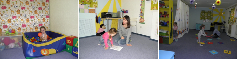 Оформление Сама комната разделена на три зоны: основную, где и проходят занятия, игровую (с пластмассовой горкой и бассейном с разноцветными шариками – как я успела заметить, для малышей это самое привлекательная часть комнаты) и творческую (стол со стульчиками – здесь дети рисуют и мастерят). По всей комнате – ковролин, так что детки бегают в носочках, сидят и валяются на полу без страха простудиться, в комнате очень тепло. На окнах – цветастые занавески, вообще, оформление – очень позитивное, в самых ярких и сочных красках.