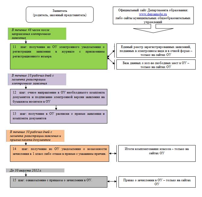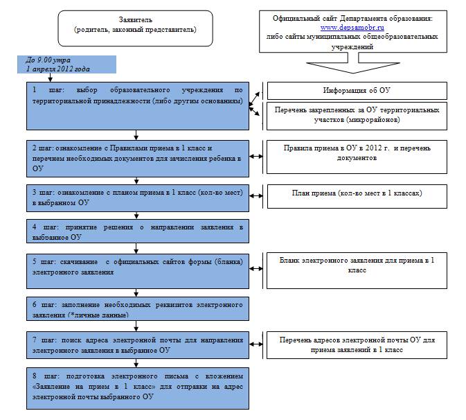 Алгоритм действий заявителя по устройству ребенка в 1 класс муниципальных общеобразовательных учреждений городского округа Самара на 2012 год.