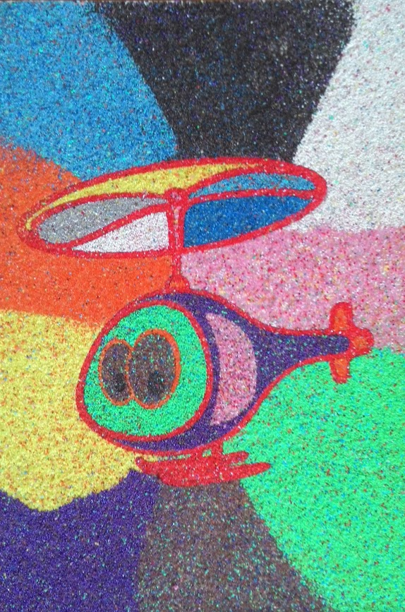 Этот рисунок сделан с помощью трафарета и арт-песка, который ребенок с помощью ложечки сыпет на картинку.