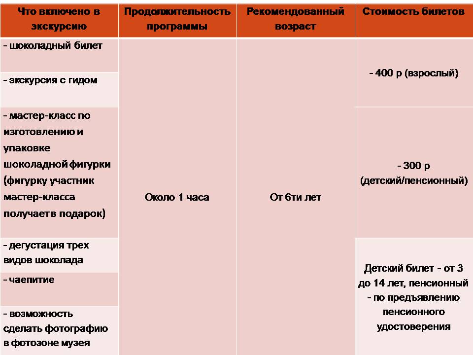 Вы знаете, откуда берется шоколад? Из магазина? Да, конечно… А откуда он берется в магазине? На экскурсии вы узнаете интересные подробности о происхождении шоколада, научитесь разбираться в его составе и оцените все ингредиенты на вкус. А еще вы сможете попробовать себя в профессии шоколатье, сделав фигурную шоколадку своими руками!