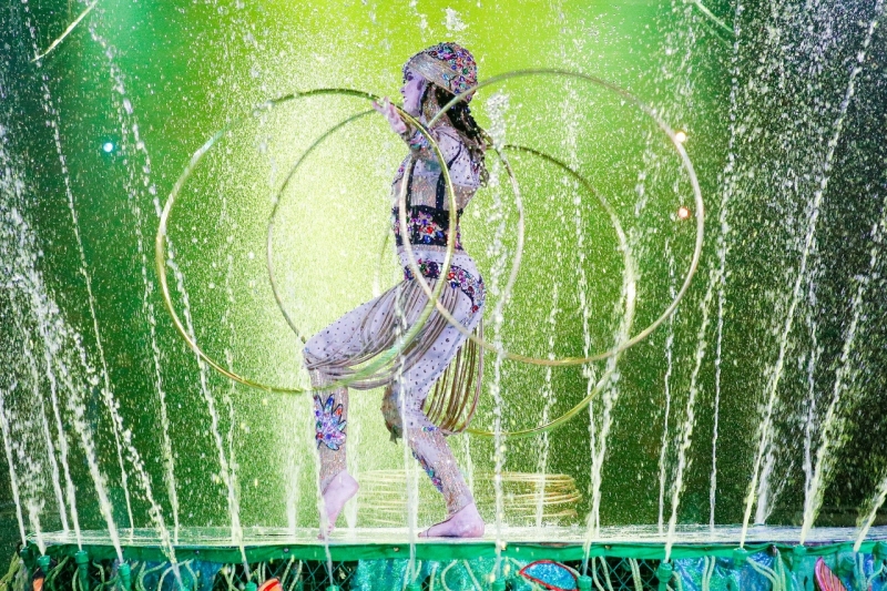 На арене дрессированные животные: морские котики и львы, питоны, нильские крокодилы, а также кошечки и голуби. Захватывающее фаер-шоу, аттракцион с мыльными пузырями и парад многоцветных фонтанов. В программе участвуют воздушные гимнасты, жонглеры и веселые клоуны.