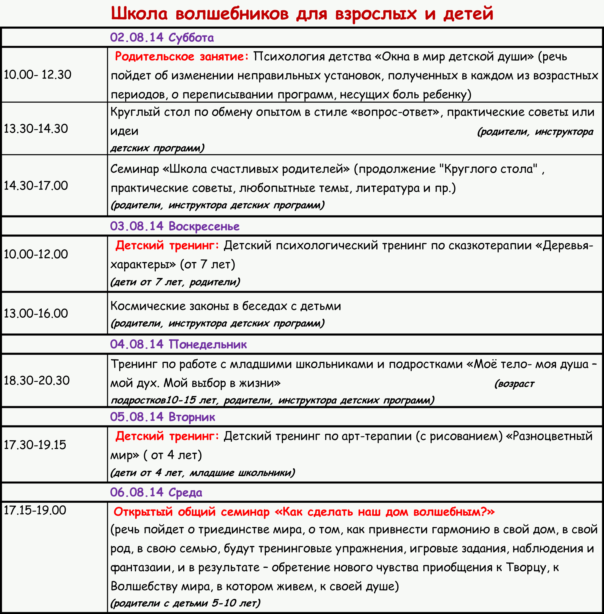 Родителей и детей приглашают на серию уникальных семинаров и тренингов. Благодаря этим знаниям вы научитесь лучше слышать, понимать и чувствовать друг друга детей и близких. Такие знания помогают сформировать самое важное для ребёнка: дружелюбную, тёплую и гармоничную атмосферу в семье, ведь это же та среда, в которой он постоянно находится, учится жить и развивается. У детей, растущих в такой атмосфере, есть все возможности вырасти здоровыми, сильными, гармоничными людьми с чистыми помыслами и благородными сердцами.