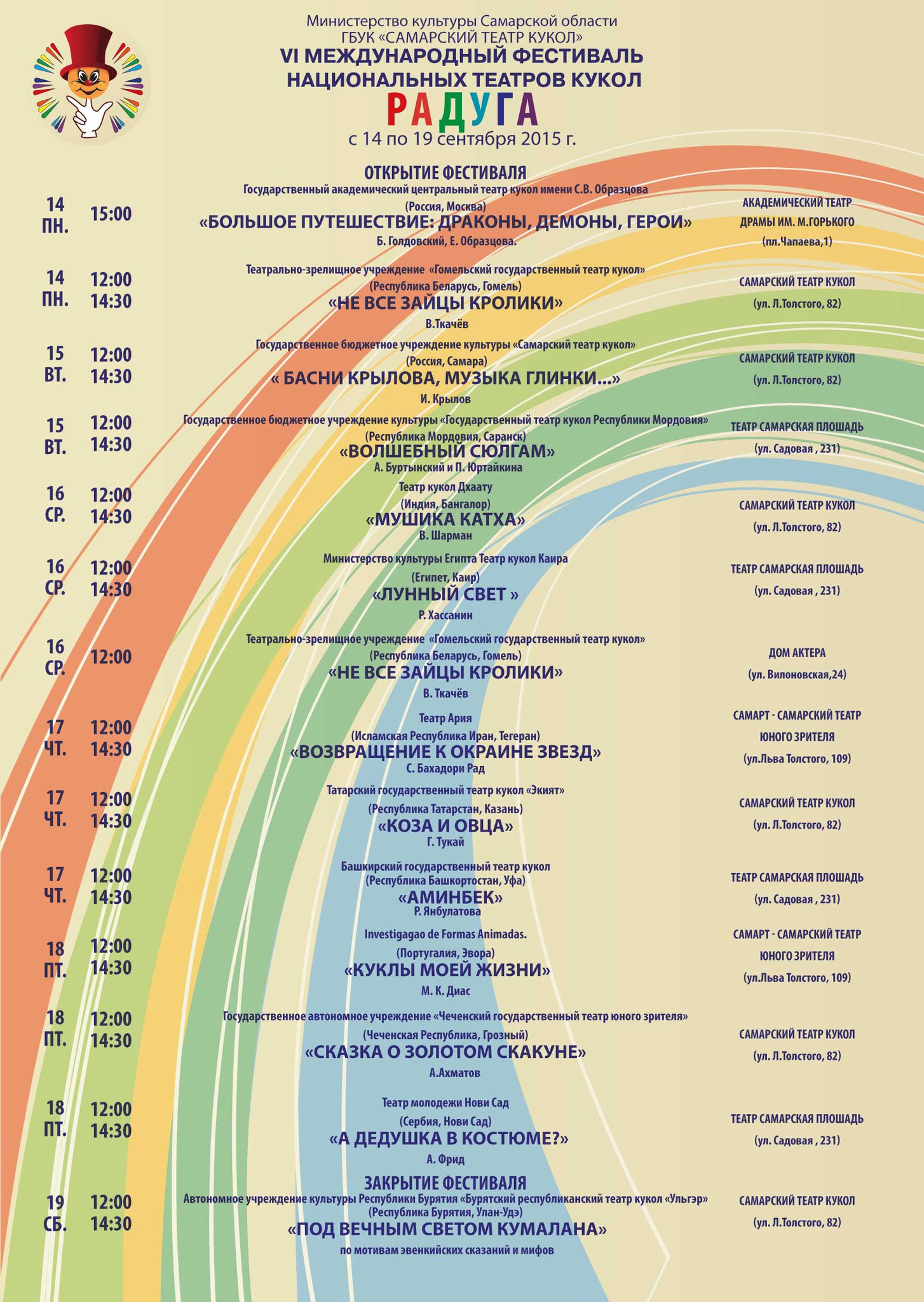 VI Международный фестиваль национальных театров кукол «Радуга» приглашает юных зрителей старше 3 лет на спектакли.