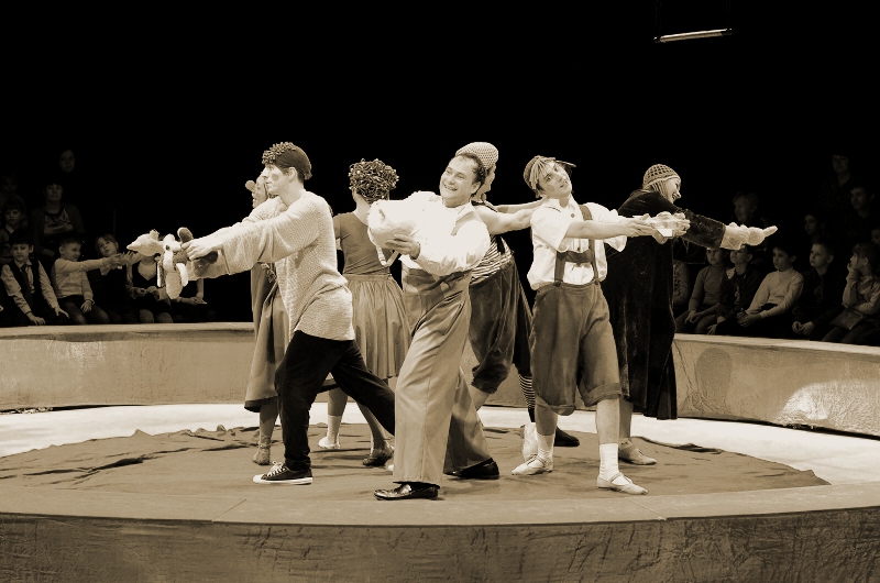 Сцена превратиться в цирковую арену. Девять нелепых, но очень симпатичных человечков-клоунов устраивают необычное представление по сказкам и стихам Корнея Чуковского. Актеры не изображают зверей или сказочных персонажей, они играют вместе со зрителями в веселую и увлекательную игру… А старшие зрители смогут «прочитать» и другой смысл представления, узнавая нашу не самую веселую страну, и не только в «Тараканище», где трусливые звери готовы отдать усатому чудовищу на ужин своих любимых деточек.